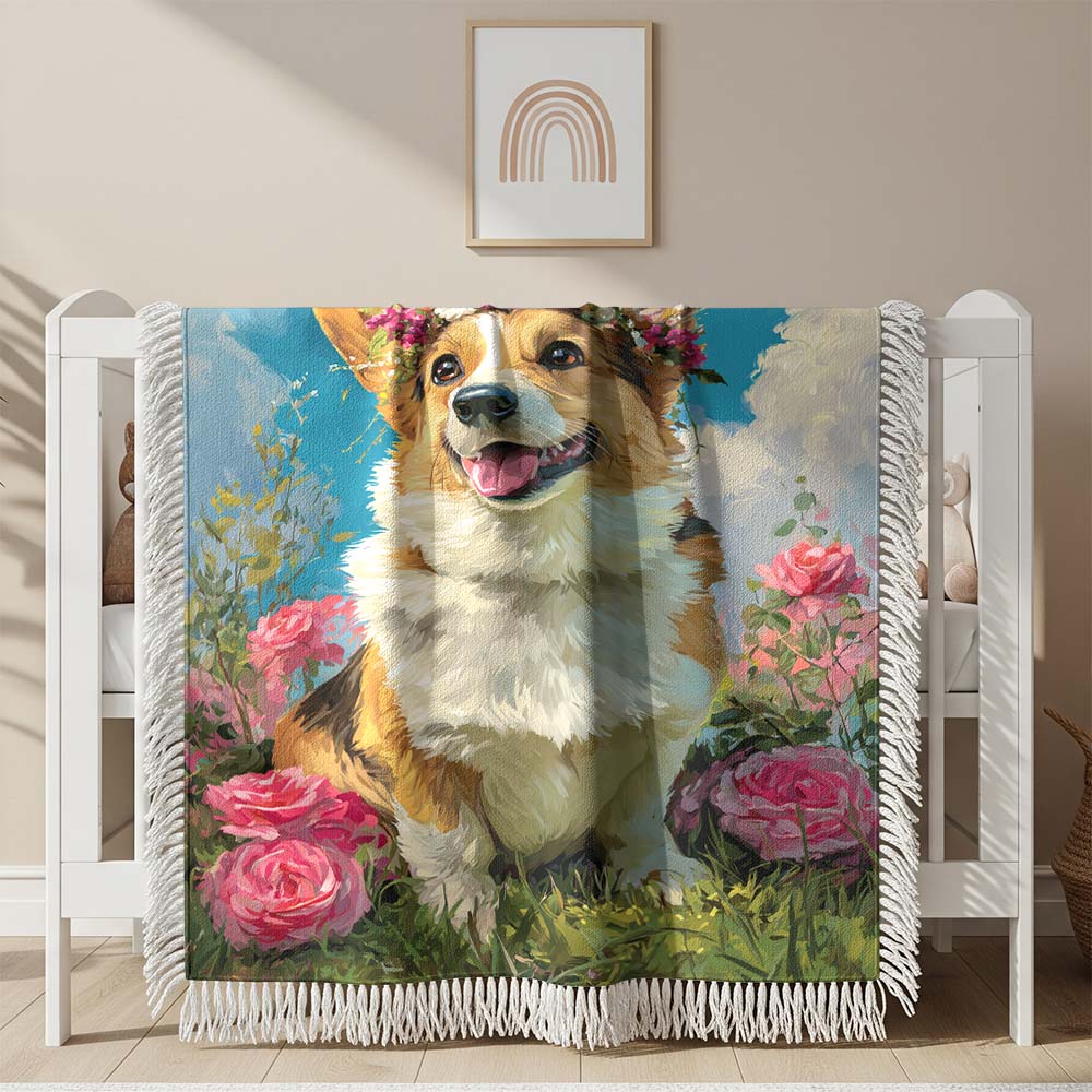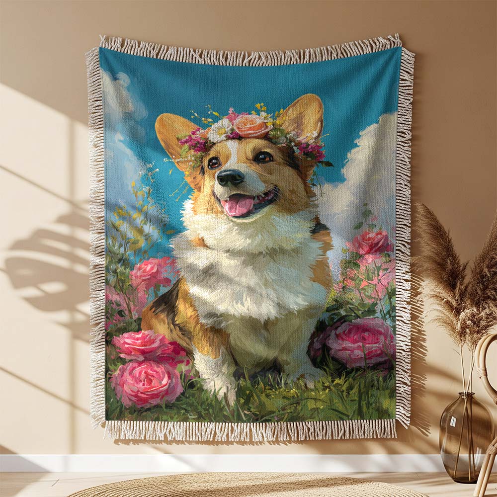 Couverture Tissée Corgi avec une Couronne de Fleurs