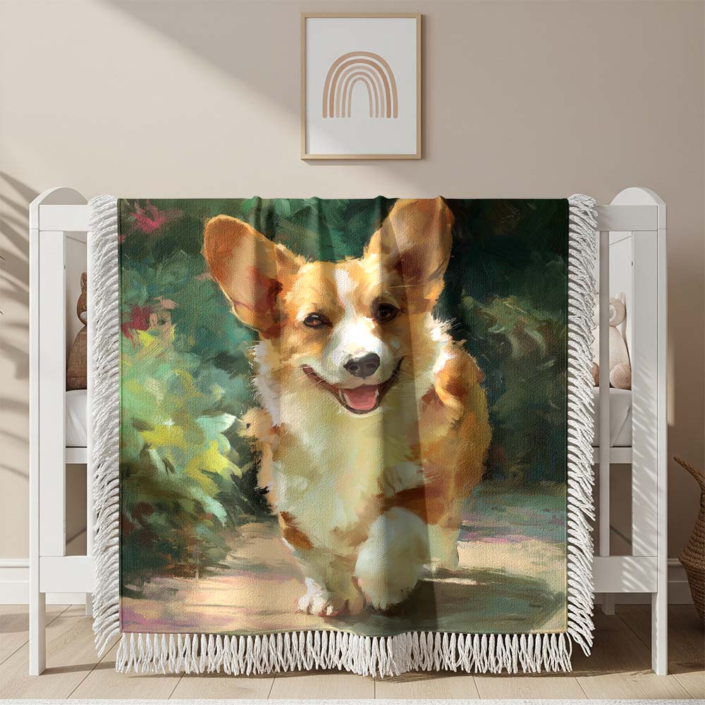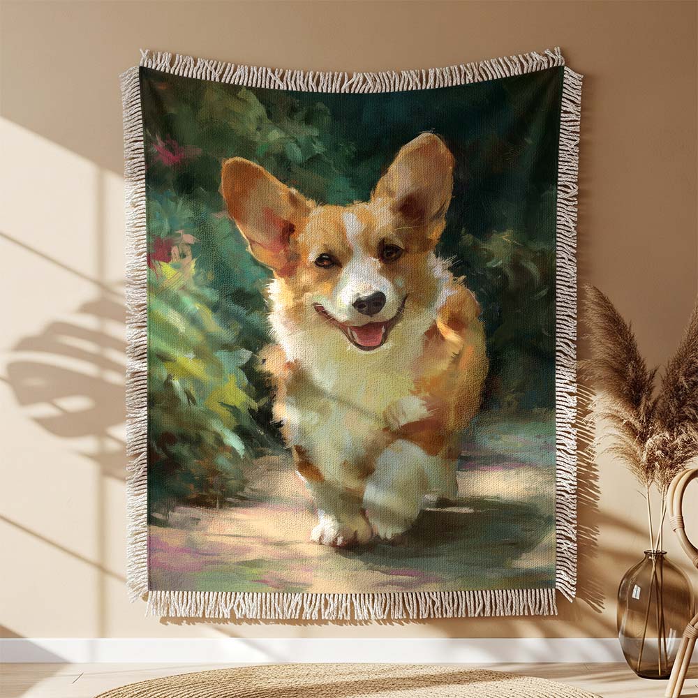 Couverture Tissée Corgi Joyeux Marchant trong un Jardin