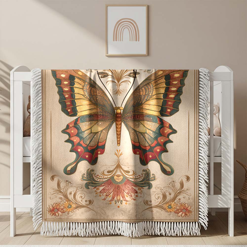 La couverture est dotée d’une bordure décorative à franges pour une finition tissée classique.